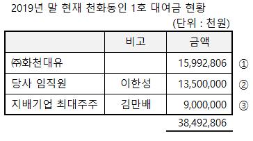 '대여금 현황'에 따르면, 화천대유에 160억원, 당사 임직원 이한성에 135억원, 지배기업 최대주주 김만배에 90억원을 꿔준 것으로 돼 있다. 그는 "천화동인 1호의 '외관상' 100% 주주는 화천대유이고, 또 화천대유의 100% 주주는 김만배이다. 즉 지배구조에 관하여 김만배 = 화천대유 = 천화동인 1호이다.(다시 말하지만 '외관상')"이라며 "특수관계자 ② 이한성은 후술토록 하고, ① 화천대유와 ③ 김만배는 왜 구분하였을까? 회계 혹은 세무 실무상 '세무 리스크'를 회피하기 위한 의도로도 비슷한 무리는 묶는 게 낫다"고 지적했다.