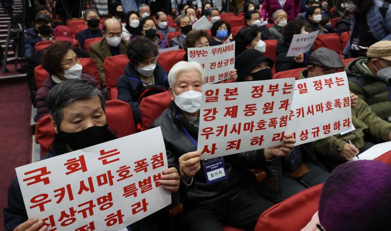 정진석 비대위원장은 토론회후 일본 정부와 정계 관계자들을 만나기 위해 일본으로 출국, 정부여당이 '3자 변제' 방식으로 강제징용 문제를 매듭지으려는 게 아니냐는 관측을 낳고 있다. 강제징용 피해자들이 12일 국회 의원회관에서 열린 강제징용 해법 토론회에서 정부여당의 타협적 해법에 피켓을 들고 강력 반발하고 있다. ⓒ연합뉴스