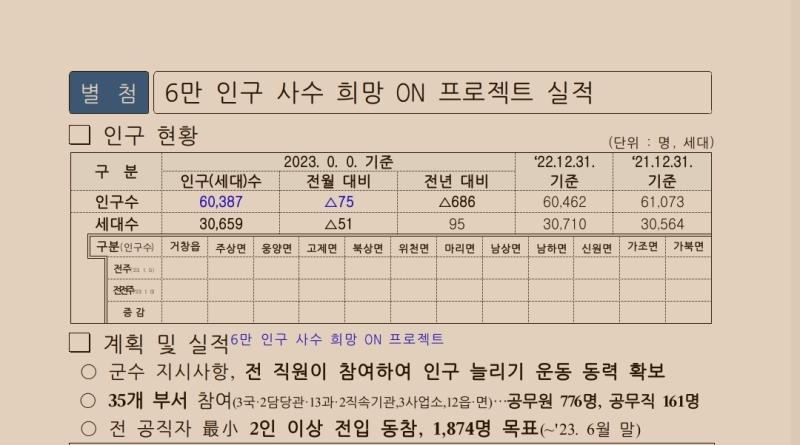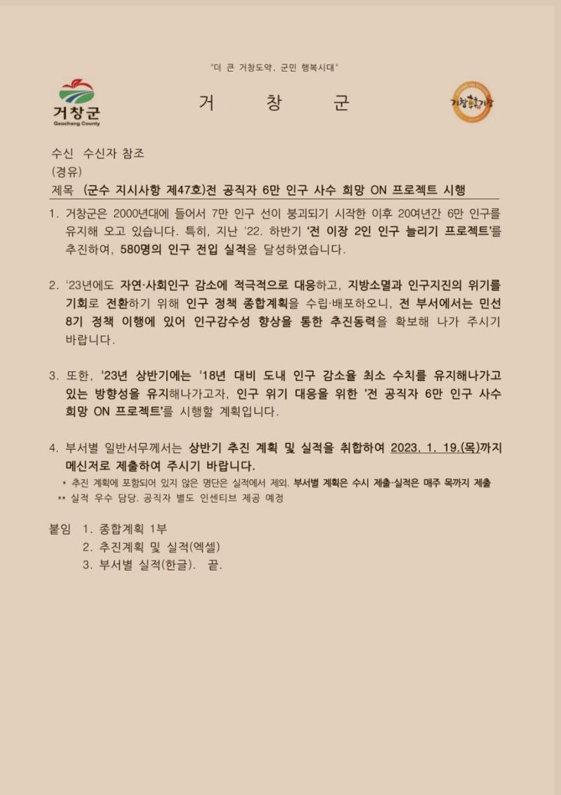 공문에는 "23년 상반기에는 '18년 대비 도내 인구 감소율 최소 수치를 유지해나가고 있는 방향성을 유지해나가고자, 인구 위기 대응을 위한 '전 공직자 6만 인구 사수 희망 ON 프로젝트'를 시행할 계획"이라며 "부서별 일반 서무께서는 상반기 추진 계획 및 실적을 취합하여 2023. 1. 19.(목)까지 메신저로 제출하여 주시기 바란다"고 지시했다.