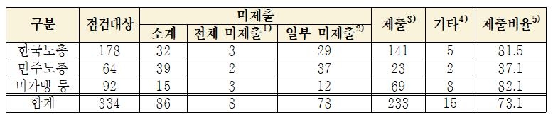 상급 단체별로 살펴보면 민주노총의 제출 비율이 37.1%에 불과해 특히 낮다.
