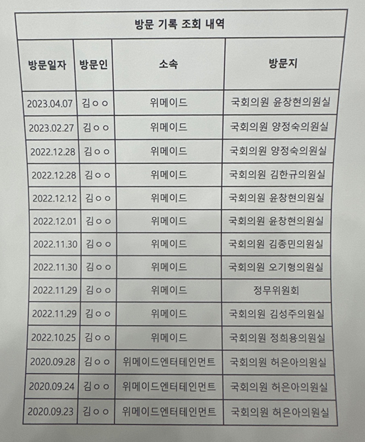 출입 기록에 따르면, 위메이드는 2020년 9월부터 지난 4월까지 여야 의원 8명의 의원실을 찾았다.