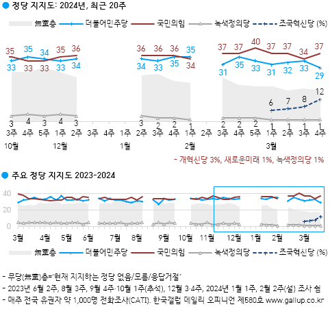 尹지지율 하락 스톱. 국힘은 반등. 민주는 조국당 잠식으로 급락