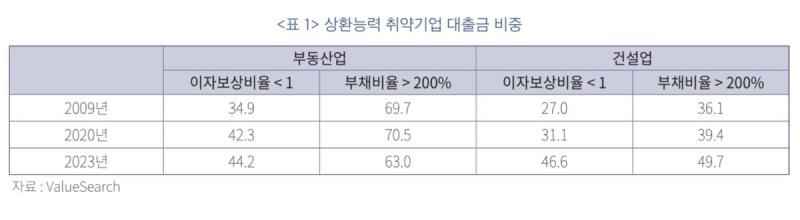 보고서는 "상환능력 취약 기업이 보유한 대출금 비중도 부동산업과 건설업 모두 글로벌 금융위기(2009년), 코로나19 팬데믹(2020년) 당시보다 높았다"고 지적했다.