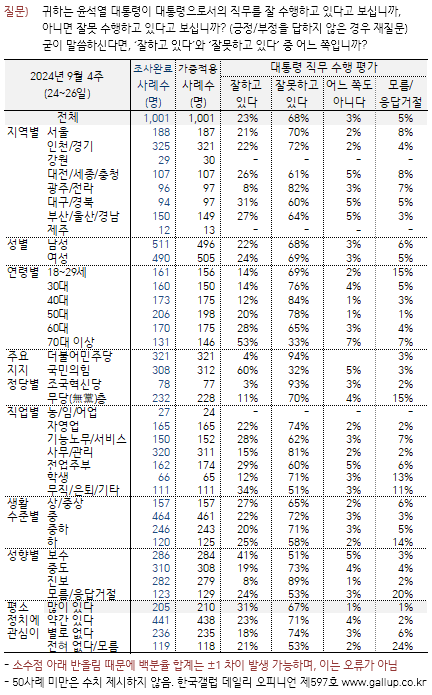 하지만 윤 대통령 지지율은 전국에서 가장 높은 보수텃밭 대구경북에서조차 31%에 그치고 부정평가는 60%에 달했다. 대구경북 지지율은 2주 전보다 4%포인트 더 떨어졌다.