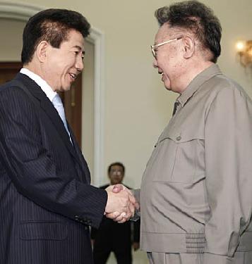 노무현 대통령과 김정일 국방위원장이 3일 오전 백화원 영빈관에서 열린 2007 남북정상회담에 앞서 악수하고 있다. ⓒ 청와대 사진기자단 노무현 대통령이 3일 오전 평양 백화원 영빈관에서 김정일 국방위원장에게 선물을 전달한 뒤 대화하고 있다. ⓒ 청와대 사진기자단 3일 오전 백화원 영빈관에서 열린 2007 남북정상회담에서 노무현 대통령과 김정일 국방위원장이 기념촬영을 한 후 회담장으로 자리를 옮기고 있다. ⓒ 청와대 사진기자단 노무현 대통령과 김정일 국방위원장이 3일 오전 평양 백화원 영빈관에서 정상회담을 하고있다. ⓒ 청와대 사진기자단 노무현 대통령과 김정일 국방위원장이 2007 남북정상회담 2일째인 3일 오전 백화원 영빈관에서 남북정상회담 1차회의를 마치고 밝은 표정으로 걸어나오고 있다. ⓒ 청와대 사진기자단