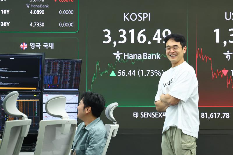 아시아 증시도 활황세여서, 일본 닛케이지수는 전 거래일보다 0.87% 오른 43,837로 장을 마치며 약 3주 만에 종가 기준 사상 최고치를 경신했다. 10일 코스피지수가 역대최고를 경신하자 딜러들이 환하게 웃고 있다. ⓒ연합뉴스