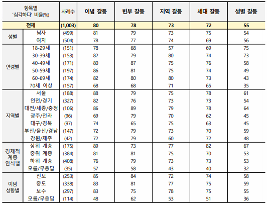 특히 ‘이념’과 ‘빈부’ 갈등에 대한 심각성 인식은 3년 연속 가장 높게 나왔다.