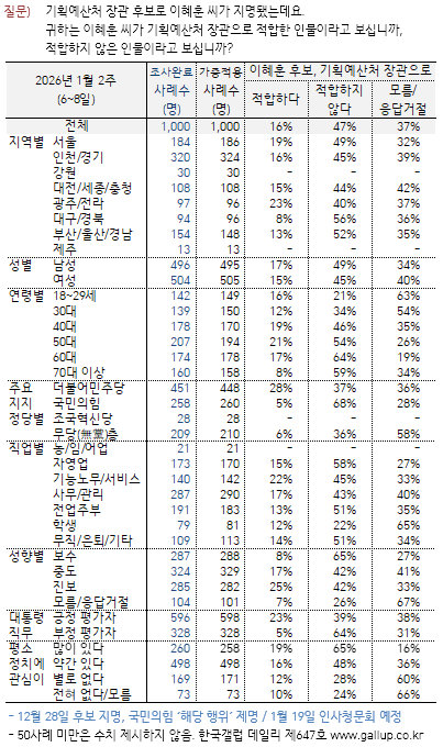 9일 <한국갤럽>에 따르면, 6~8일 전국 성인 1천명을 대상으로 이혜훈 후보에 대해 물은 결과 '기획예산처 장관으로 적합하다'는 응답은 16%에 그쳤고, '적합하지 않다'는 47%로 나타났다.