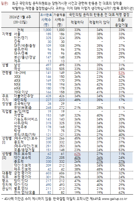 극보수자('매우 보수적' 61명, ±12%포인트)는 적절 62%:부적절 27%, 약보수자('약간 보수적' 205명) 40%:36%, 중도층('중도적' 332명) 26:37%로 견해차가 드러난다. 극보수자를 제외하면 이외 대부분 응답자 특성에서 양론 격차가 오차범위를 크게 벗어나지 않는다.