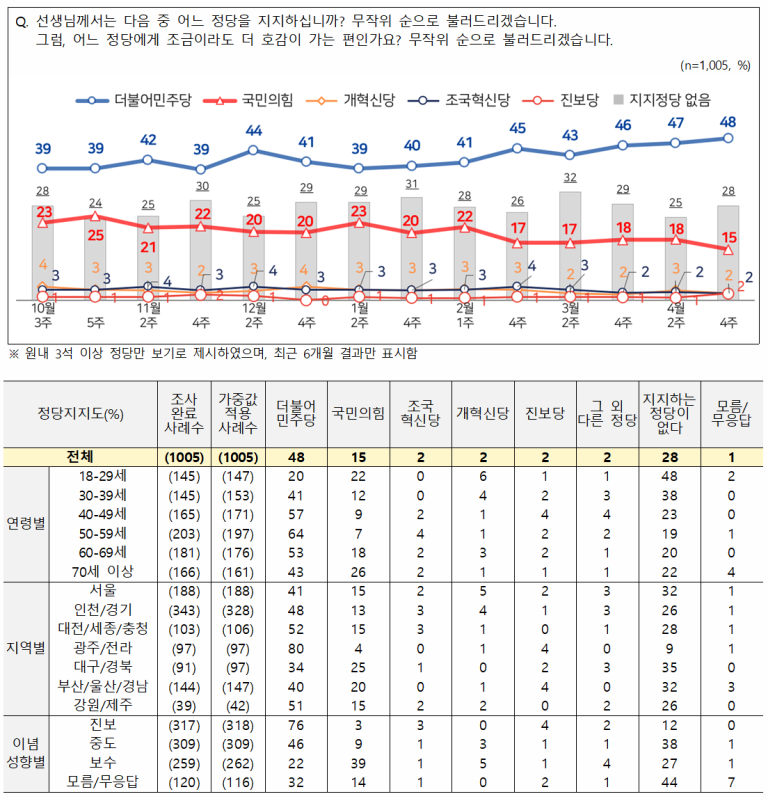 정당 지지율은 더불어민주당 48%, 국민의힘 15%, 조국혁신당 2%, 개혁신당 2%, 진보당 2% 순이었으며, 태도유보는 29%였다.