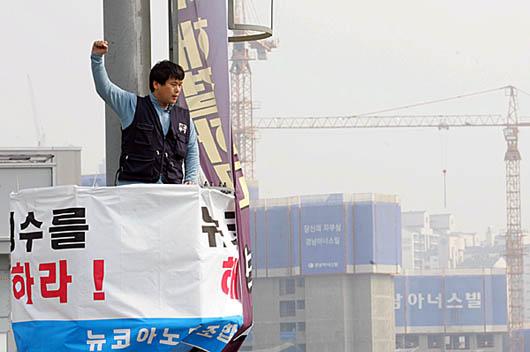 지난 10월 23일 광흥창역 이랜드 본사 부근 교통관제탑에 올라 고공농성에 돌입한 박명수 뉴코아 노조 조합원.ⓒ민주노총