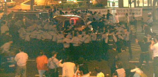 박근혜 한나라당대표에게 테러를 자행한 지충호씨가 탑승한 차량이 21일 밤 서울 서대문경찰서에서 경찰들의 호위를 서받으며 서울서부지검으로 출발하고 있다. 지씨 이송은 박근혜 대표 지지자들의 격렬 항의로 당초 예정시간보다 3시간 늦어졌다. ⓒ연합뉴스