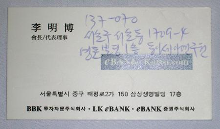 이 전대사가 증거로 내놓은 문제의 명함에는 'eBank-Korea.com, BBK투자자문회사, LK-eBank· eBANK증권주식회사'라는 명칭 위에 '李明博 會長/代表理事'라는 직함이 새겨져 있다.