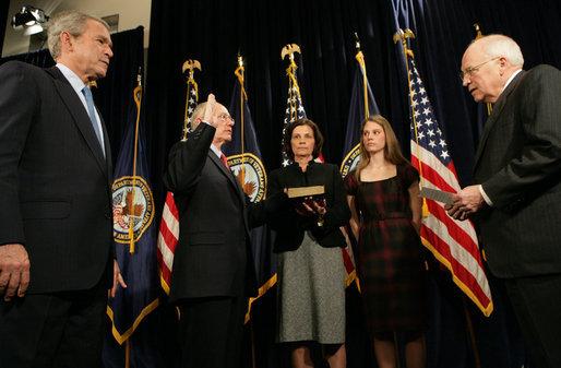 미국의 신안보전략이 최근 일본의 해상미사일 요격실험 성공에 따른 미사일방어 체제 합류로 아시아에서 더큰 위력을 발휘하기 시작했다. 신안보전략을 뒷받침해온 조지 W. 부시(왼쪽) 대통령과 딕 체니(오른쪽) 부통령이 20일(현지시간) 백악관에서 제임스 피크 신임 퇴역군인부 장관에게 임명장을 수여하고 있다. ⓒ 미 백악관