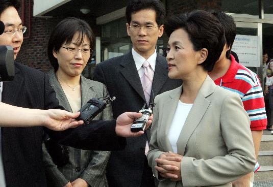 31일 오전 열린우리당 강금실 서울시장후보가 서울 강남구 봉은중학교 투표소에서 투표를 한 후 기자들의 질문에 답하고 있다. ⓒ연합뉴스