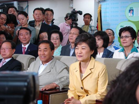 31일 밤 당사에 나타난 박근혜 한나라당 대표가 흐뭇한 표정으로 개표상황을 지켜보고 있다. ⓒ이영섭 기자