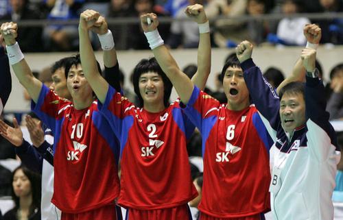 지난달 30일 일본 도쿄 요요기 국립실내경기장에서 열린 2008 베이징 올림픽 아시아 핸드볼 남자부 재예선에서 한국의 김태훈 감독을 비롯한 선수들과 코칭스태프들이 코트의 선수들이 후반 승리에 쐐기를 박는 슛을 성공하자 환호하고 있다 ⓒ연합뉴스