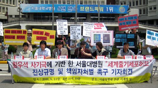 지난 5월 12일 ‘과학계의 성수대교 사건’이라며 대국민 사기극으로 최종결론 난 ‘황우석 사태’와 관련, 시민사회단체들이 서울대 병원이 국가예산을 지원받아 추진했던 ‘세계줄기세포허브’에 대한 진상규명 조사를 요구하고 나섰다.