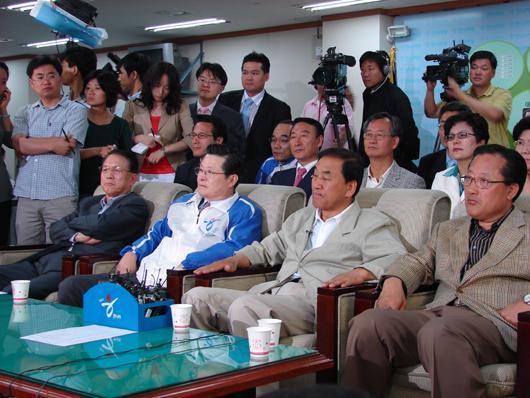이재오 원내대표 등 한나라당 당직자들이 지방선거 출구조사 결과를 심각하게(?) 지켜보고 있다. ⓒ이영섭 기자