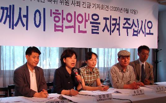이와 관련 최종 합의안 도출을 주도한 특위위원 7명은 12일 서울 종로구 안국동 느티나무 카페에서 기자회견을 열고 “교육부의 집요한 방해와 기존 승진제에 이해관계가 걸려있는 교육학자, 교총 소속 학교장들이 어렵게 합의한 시안을 폐기시켰다”고 비난하며 위원직을 사퇴했다.