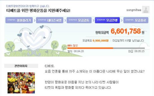 포탈사이트 '다음'의 모금청원 게시판에서 진행된 티베트 평화운동 지원모금에는 29일 현재1천3백여명의 네티즌들이 6백50여만원의 성금을 지원했다.