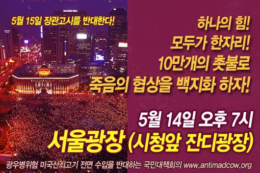 미국산 쇠고기 수입에 반대하는 시민들의 촛불문화제가 정부의 미국산 소고기 수입 위생조건 장관 고시를 하루 앞둔 14일 절정에 달할 전망이다. 이번 목표는 10만명 운집이다.