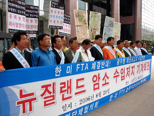 한미FTA저지 농축수산비상대책위원회와 축산관련단체협의회는 20일 오전 서울 광화문 뉴질랜드 대사관 앞에서 기자회견을 열고 '미국산 쇠고기, 뉴질랜드산 암소 수입 중단'을 촉구했다.