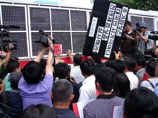 대책회의 관계자 20여명은 20여분만에 기자회견을 마치고 청와대에 항의 서한을 전달하기 위해 인도를 향해 진입을 시도했지만 현재 전경버스 2대에 가로막혀 그 앞에서 연좌농성을 벌이고 있다.