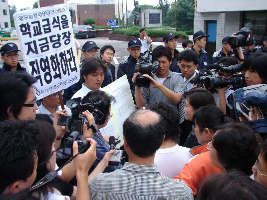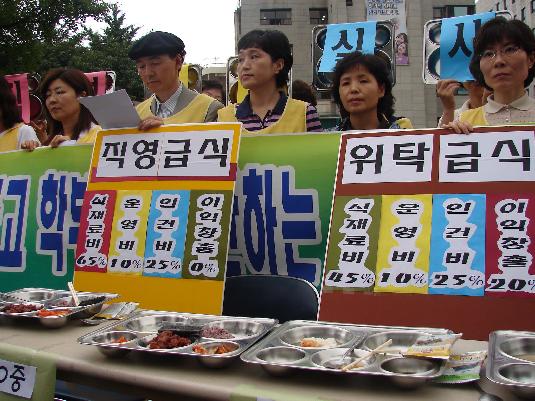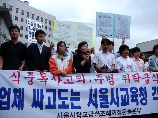 학교급식네트워크, 전교조, 민주노동당을 비롯한 40개 시민단체로 구성된 서울시 학교조례제정운동본부와 참교육을위한전국학부모회는 26일 오전 서울시 종로구 신문로 서울시 교육청 앞에서 각각 기자회견을 열어 ‘위탁급식 업체의 직영급식 전환, 교육당국 책임자 처벌’을 촉구했다.