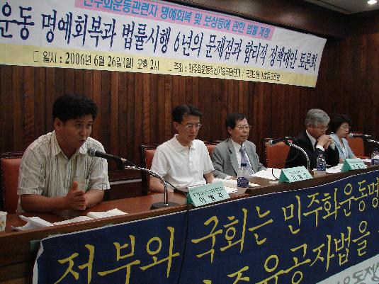 민주화운동정신계승국민연대는 26일 국회도서관 소회의실에서 ‘민주화운동 명예회복과 법률시행 6년의 문제점과 합리적 정책대안 토론회’를 갖고 각계 각층의 민주화 진영 단체들을 초대해 의견을 나눴다.