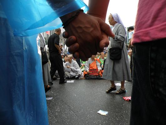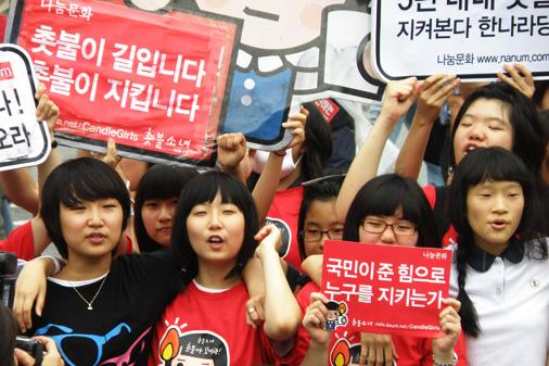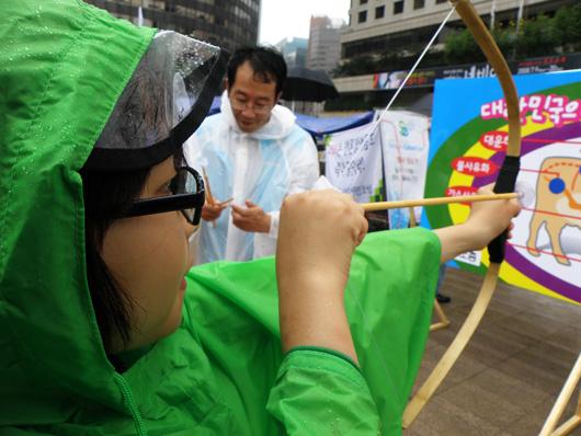 시울시청 광장에 '꼬마 로빈 훗'이 나타났다. 과녁은 '대한민국의 SRM'.ⓒ김혜영 기자 촛불 소녀들이 단체로 율동과 함께 노래를 부르고 있다.ⓒ김혜영 기자 비가 오는 날씨에도 유모차를 끈 주부들이 서울광장으로 진입하자 시민들이 박수를 치며 환호하고 있다.ⓒ김혜영 기자 촛불집회에 참석한 한 신부가 장미 꽃을 들고 있다.ⓒ김혜영 기자 시민들이 손을 맞잡고 가이드 라인을 만들어 촛불집회에 참석한 종교단체와 시민들을 보호하고 있다.ⓒ김혜영 기자