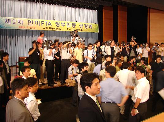 한미 자유무역협정(FTA) 2차 본협상을 앞두고 정부가 주최한 정부합동 공청회가 예상대로 시민단체의 격렬한 반발 속에 오전 일정이 무산됐다.
