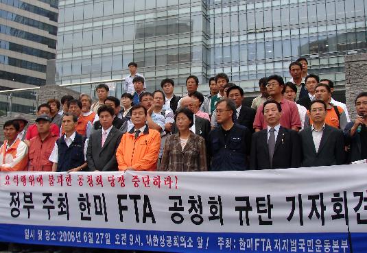 이에 따라 이날 범국본은 공청회가 열리기 1시간 전인 오전 9시 대한상공회의소 앞에서 각 분야 대표 60여명이 모인 가운데 기자회견을 열어 “정부가 국민에게 협상내용도 알려주지 않고 비판적인 의견 개진 기회조차 외면하는 기만적이고 폐쇄적인 밀실 공청회를 진행하려 한다”며 “2차 공청회를 즉각 중단하고 한미협상 내용을 바탕으로 17개 분야가 충실히 토론되는 방식의 공청회를 시민사회와의 합의를 통해 진행해야한다”고 주장했다.