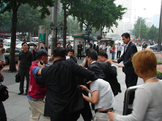 한편 이 날 기자회견 도중 노동단체 조합원이 기자회견을 곁에서 감시하고 있던 삼성본사 경비직원들에게 “감시를 말아 줄 것”을 요구하며 시비가 붙어 양측간에 물리적 충돌사태까지 발생하기도 했다.