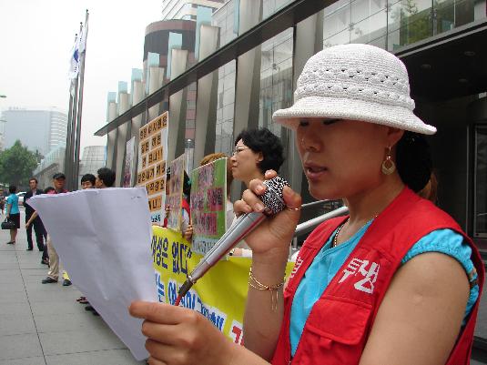 삼성 측으로부터 부당해고를 당했다고 주장하는 한 여성노동자가 그간 발생된 삼성의 부당노동행위들을 증언하고 있다 ⓒ뷰스앤뉴스