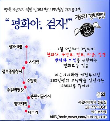 평택 미군기지 확장저지 범국민대책위와 서울대책회의는 오는 7월 5일부터 9일까지 닷새에 걸쳐 7월부터 시작될 국방부의 빈집 철거와 FTA 2차 본협상을 사회적으로 쟁점화시키기 위해 청와대에서 평택 대추리까지 행진을 벌이기로 했다.