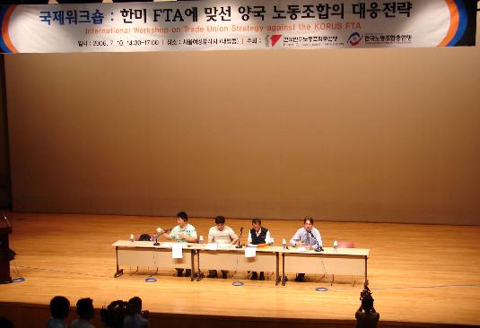 민주노총과 한국노총이 주관한 국제워크샵에서 양국을 대표하는 발제자들이 한미FTA가 양국 노동계에 미칠 영향에 대해 발표하고 있다.ⓒ최병성