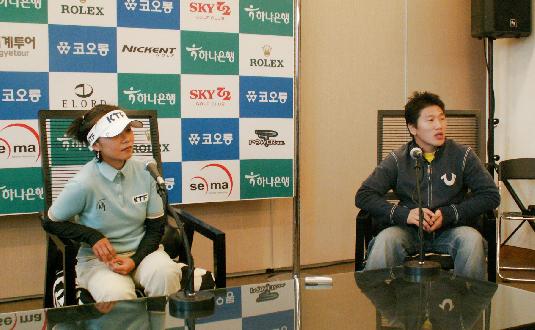 지난 2일 'LPGA 하나은행-코오롱 챔피언십'이 벌어진 인천 스카이72 골프코스 클럽하우스에서 피앙세 김미현(왼쪽)과 기자들의 질문에 답하고 있는 이원희(오른쪽) ⓒ임재훈 기자