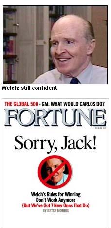 12일 발행된 <포천> 최신호는 ‘잭 웰치의 경영지침서 찢어버리기’(Tearing up the Jack Welch playbook)라는 제목의 베시 모리스 기자의 기명 기사를 통해 "웰치의 경영전략은 '주식회사 미국'의 '경영 바이블'로 통했으나 이제는 세상이 급변해 ‘낡은 옛날 성공이론’으로 경영현장에서 퇴장했다"며 웰치 전 회장이 주창한 ‘옛날 원칙’ 7가지 항목과 ‘새로운 원칙’을 조목조목 비교 분석했다.