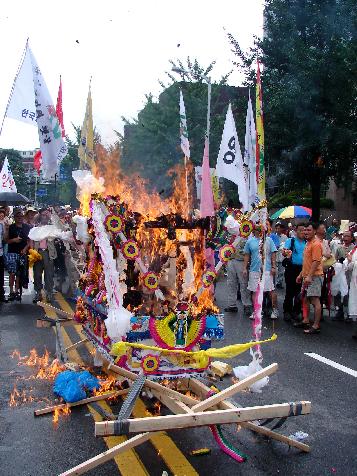 범국본이 지난 2일 스크린쿼터 반대 집회에서 화형식을 치뤘던 ‘한미 FTA 오적’에 대한 상여를 짊어매고 을지로 훈련원 공원에서 신라호텔 앞까지 행진, 상여를 태우는 상징의식이었다.