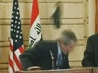 이 순간 한 기자가 벌떡 일어나 "이 전쟁은 끝났다"고 반박한 뒤, "이것은 이별 키스다. 개XX"라고 아랍어로 욕설을 퍼부었다. 그는 곧바로 부시 대통령을 향해 신발 한짝을 벗어 던졌고, 곧이어 두번 째 신발이 날아갔다. 부시 대통령은 첫번째 다가오는 신발을 피했으며 두번째 신발은 대통령 머리위로 아슬아슬하게 비켜갔다.