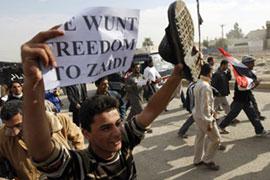 15일 바그다드에서는 부시에게 신발을 던진 무탄다르 기자의 석방을 촉구하는 시민들이 신발을 들고 시위를 벌였다. ⓒ<알 자지라>