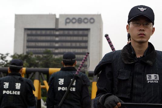 비정규직 건설노동자들이 주도한 포스코 사태가 노-정 전면전 양상으로 발전하고 있다. 포스코 본사를 둘러싸고 있는 경찰들. ⓒ연합뉴스