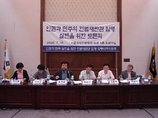 오는 8~9월 윤영철 헌법재판소장을 비롯해 퇴임하는 5명의 헌법재판관 후임인사에 대한 관심이 높아가는 가운데 민주사법국민연대(공동집행위원장 이상수), 새사회연대(대표 이창수), 법원공무원노동조합(서울시본부장 양윤석) 등 ‘인권과 민주실현을 위한 헌법재판관 임명공대위’는 31일 오후 서울중앙지방법원 동관 4층 중강당에서 ‘인권과 민주의 헌법재판관 임명 실현을 위한 토론회’를 열고 후임 헌법재판소 재판관의 인선기준에 대한 토론을 가졌다.