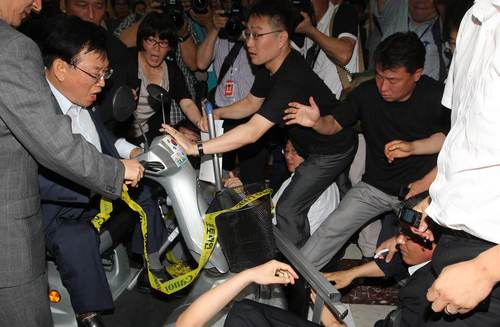 이날 낮 12시30분께 김형오 의장의 본회의장 진입로를 마련하려는 국회 경위들과 민주당간에 30여분간 치열한 몸싸움이 벌어졌다. 이 과정에서 민주당 강기정 의원 등은 경위들에게 머리를 맞았고 이에 보좌진들이 강력 항의하자, 한 경위는 “의원이 뭔데…”라고 맞받아 거센 말들이 오가기도 했다.