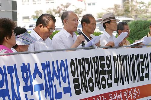 강제동원진상규명시민연대는 18일 서울 중구 충무로 극동빌딩 앞에서 기자회견을 열고 이날 출범한 ‘친일반민족행위자 조사위원회(위원장 김창국)’가 앞으로 환수할 ‘친일파’ 재산을 일제강점하 피해자 및 유족들에게 돌려줄 것으로 촉구했다.