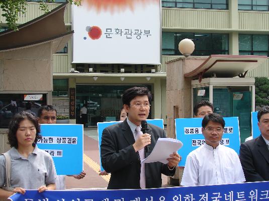 23일 오전 서울 세종로 문화관광부 청사 앞에서 '도박규제네트워크' 관계자들이 사행성 도박산업 전반에 대한 근본적인 대책을 촉구하는 기자회견을 열고 있다.ⓒ뷰스앤뉴스