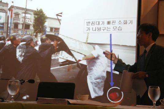 또한 김 과장은 하중근씨 조합원의 두피열상의 위치와 상태를 거론하며 “상식적으로 집회 현장에서 방패 모서리 가격 이외에 5cm길이의 일직선 자상을 낼 수 있는 게 무엇인가”라고 반문하며 당시 현장에서 경찰들이 고무패킹을 떼고 시위대를 가격하는 사진을 증거로 제시했다.
