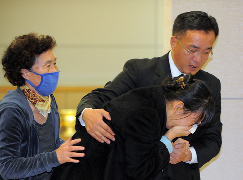27일 경남 양산부산대병원에 마련된 故 오근섭 양산시장의 분향소를 찾은 유가족들이 오열하고 있다. 오 시장은 이날 오전 7시 10분께 양산시 상북면 자택이 있는 농장 별채 부엌에서 목을 매 숨진 채 발견됐다. ⓒ연합뉴스 한편 손정근 양산경찰서장은 이날 오후 양산 부산대학교병원에서 열린 브리핑을 통해 "오 시장은 27일 오전 7시경 양산시 상북면 자신의 주거지인 D농장 별채 부엌에서 태극기와 양산시기를 두른 채 목을 매 사망했다"며 <부산일보> 보도내용이 사실임을 확인했다.