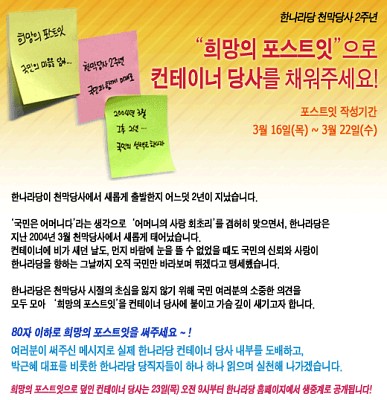 이와 함께 지난 16일부터 당 홈페이지를 통해 받은 국민의 소리를 포스트잇에 적어 컨테이너 당사 전체를 장식, 주요당직자들이 국민의 소리를 한장 한장 떼어 읽으면서 그간의 소회를 밝히고 앞으로 한나라당이 새롭게 거듭나서 초심으로 돌아가고자 하는 방향을 밝힌다는 계획이다.